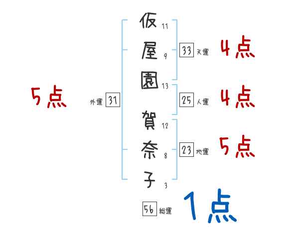 総運![]() | 仮屋園賀奈子さんの総運は56画の1つ星!消極的で無気力になりがち。誠実な気持ちが必要でしょう。 あなたの人生を表す1番重要な運勢です。生涯を通じて影響する総合運となり、主に50歳以降の晩年期に影響を及ぼします。 |