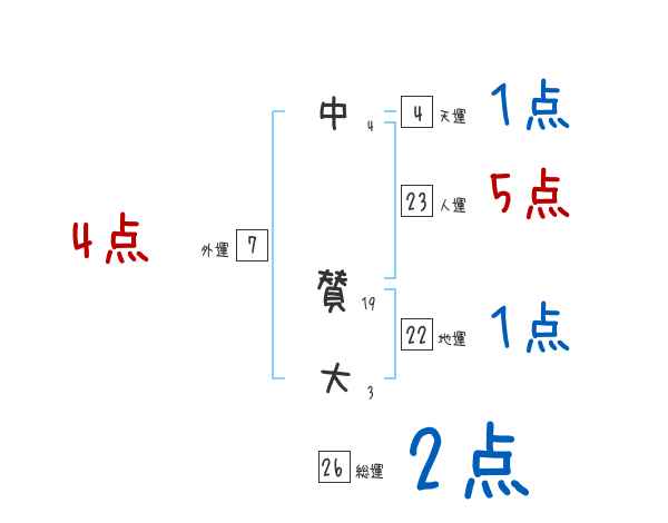 人運![]() | 中賛大さんの人運は23画の5つ星!想像力に優れ活力がある。一代で成功し名誉を手に入れる。 性格や才能などを表す2番目に重要な運勢です。人間関係や協調性、社会的な成功に影響します。主に20歳から50歳ぐらいまでの中年期の運勢を表します。 |