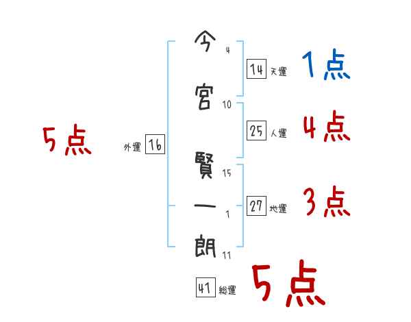 外運![]() | 今宮賢一朗さんの外運は16画の5つ星!人望が厚く大きく発展する。逆転成功が見える。 生活面を象徴する運勢です。外部から受ける影響力を表し、結婚運、家庭運や職場、環境への順応性を表します。 |