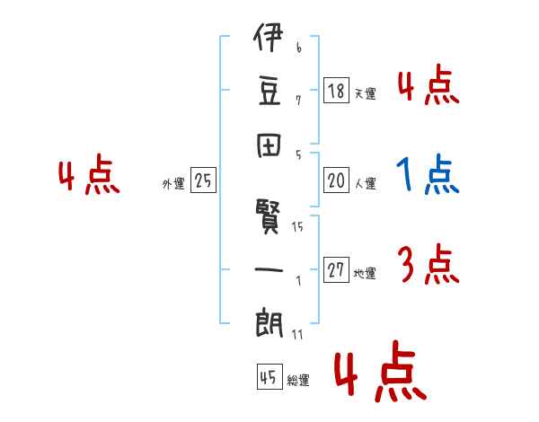 天運![]() | 伊豆田賢一朗さんの天運は18画の4つ星!情熱的で剛気。忍耐力があり信頼される。 家系が持つ宿命的な運勢を表します。祖先から受け継いだ苗字ですので自分の力が及びません。家柄を象徴します。 |