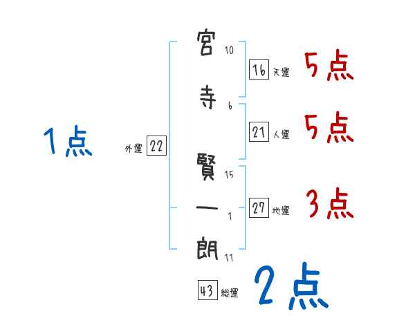 外運![]() | 宮寺賢一朗さんの外運は22画の1つ星!努力することが苦手ないっぽう手先が器用。芸術性にも優れる。 生活面を象徴する運勢です。外部から受ける影響力を表し、結婚運、家庭運や職場、環境への順応性を表します。 |