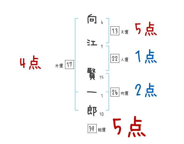 外運![]() | 向江賢一郎さんの外運は17画の4つ星!積極的な行動力。地位を気づき財産を手に入れる。純粋な心と直感力。 生活面を象徴する運勢です。外部から受ける影響力を表し、結婚運、家庭運や職場、環境への順応性を表します。 |