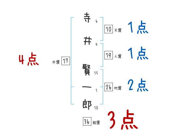 外運![]() | 寺井賢一郎さんの外運は17画の4つ星!積極的な行動力。地位を気づき財産を手に入れる。純粋な心と直感力。 生活面を象徴する運勢です。外部から受ける影響力を表し、結婚運、家庭運や職場、環境への順応性を表します。 |