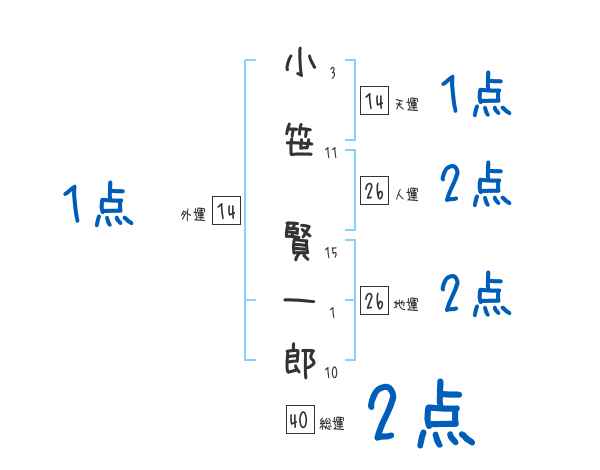 天運![]() | 小笹賢一郎さんの天運は14画の1つ星!人に対して優しいがストレスを溜め込みがち。人間関係のトラブルを避けるよう気をつけましょう。 家系が持つ宿命的な運勢を表します。祖先から受け継いだ苗字ですので自分の力が及びません。家柄を象徴します。 |