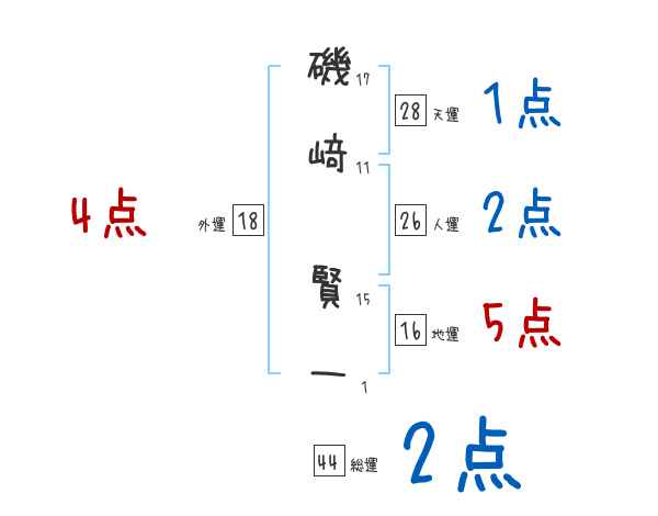 天運![]() | 磯﨑賢一さんの天運は28画の1つ星!家庭環境に注意。スポーツで活躍できる能力があるかも。 家系が持つ宿命的な運勢を表します。祖先から受け継いだ苗字ですので自分の力が及びません。家柄を象徴します。 |