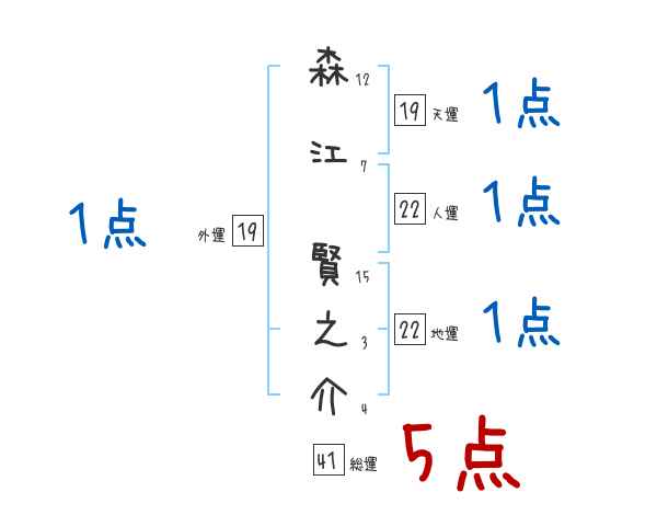 天運![]() | 森江賢之介さんの天運は19画の1つ星!優れた才能を持ちますが、協調性が足りないことも。周りの人と協力する事を意識しましょう。 家系が持つ宿命的な運勢を表します。祖先から受け継いだ苗字ですので自分の力が及びません。家柄を象徴します。 |