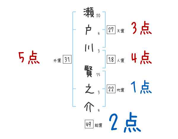 天運![]() | 瀬戸川賢之介さんの天運は27画の3つ星!頭脳明晰だが強情で摩擦が多い傾向。孤立に注意。 家系が持つ宿命的な運勢を表します。祖先から受け継いだ苗字ですので自分の力が及びません。家柄を象徴します。 |