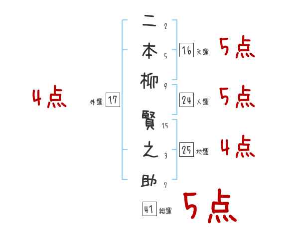 外運![]() | 二本柳賢之助さんの外運は17画の4つ星!積極的な行動力。地位を気づき財産を手に入れる。純粋な心と直感力。 生活面を象徴する運勢です。外部から受ける影響力を表し、結婚運、家庭運や職場、環境への順応性を表します。 |