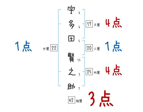 総運![]() | 宇多田賢之助さんの総運は42画の3つ星!病気に注意。多芸であるが消極的でおとなしい。 あなたの人生を表す1番重要な運勢です。生涯を通じて影響する総合運となり、主に50歳以降の晩年期に影響を及ぼします。 |
