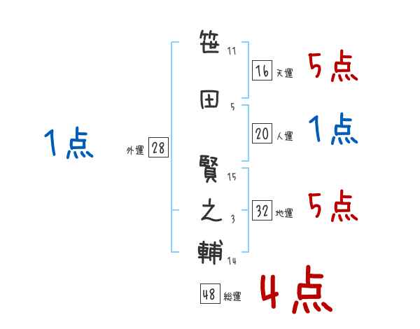 天運![]() | 笹田賢之輔さんの天運は16画の5つ星!人望が厚く大きく発展する。逆転成功が見える。 家系が持つ宿命的な運勢を表します。祖先から受け継いだ苗字ですので自分の力が及びません。家柄を象徴します。 |
