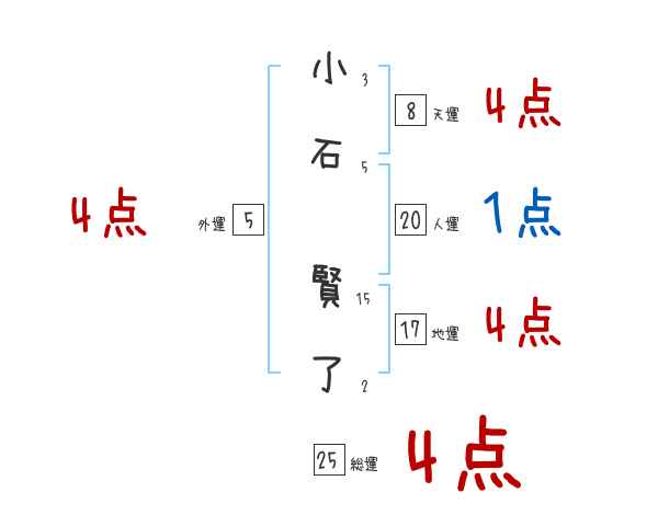 天運![]() | 小石賢了さんの天運は8画の4つ星!勤勉家。根気強く努力し成功する。忍耐力がある。 家系が持つ宿命的な運勢を表します。祖先から受け継いだ苗字ですので自分の力が及びません。家柄を象徴します。 |