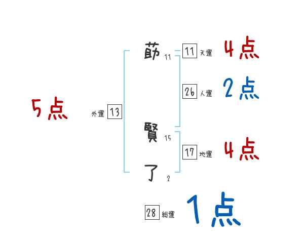 総運![]() | 莇賢了さんの総運は28画の1つ星!家庭環境に注意。スポーツで活躍できる能力があるかも。 あなたの人生を表す1番重要な運勢です。生涯を通じて影響する総合運となり、主に50歳以降の晩年期に影響を及ぼします。 |