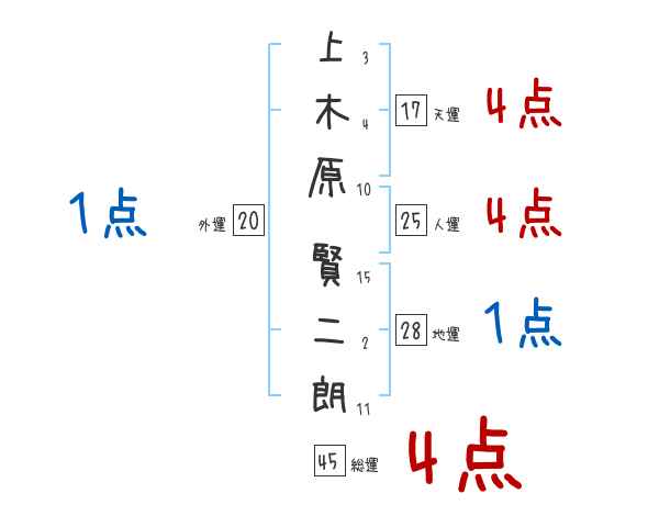 天運![]() | 上木原賢二朗さんの天運は17画の4つ星!積極的な行動力。地位を気づき財産を手に入れる。純粋な心と直感力。 家系が持つ宿命的な運勢を表します。祖先から受け継いだ苗字ですので自分の力が及びません。家柄を象徴します。 |