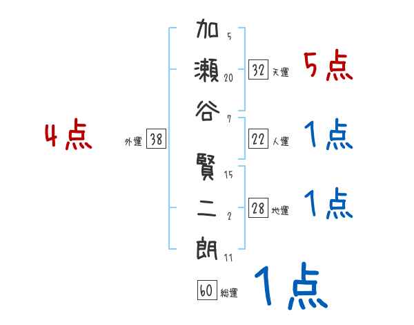 天運![]() | 加瀬谷賢二朗さんの天運は32画の5つ星!柔軟性があり成功する。チャンスが多く金運が良い。 家系が持つ宿命的な運勢を表します。祖先から受け継いだ苗字ですので自分の力が及びません。家柄を象徴します。 |