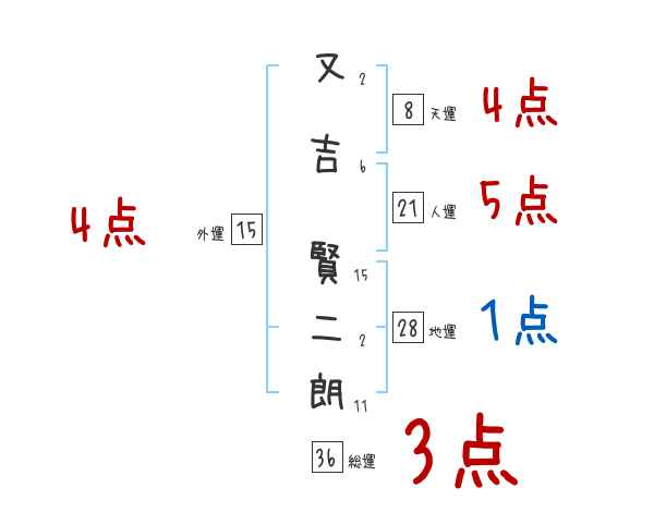 総運![]() | 又吉賢二朗さんの総運は36画の3つ星!先見性が豊かです。多少神経質で苦労することも。 あなたの人生を表す1番重要な運勢です。生涯を通じて影響する総合運となり、主に50歳以降の晩年期に影響を及ぼします。 |