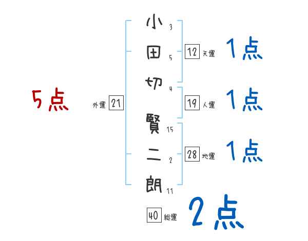 外運![]() | 小田切賢二朗さんの外運は21画の5つ星!統率力がある。独立し成功する。名誉を手に入れる。 生活面を象徴する運勢です。外部から受ける影響力を表し、結婚運、家庭運や職場、環境への順応性を表します。 |