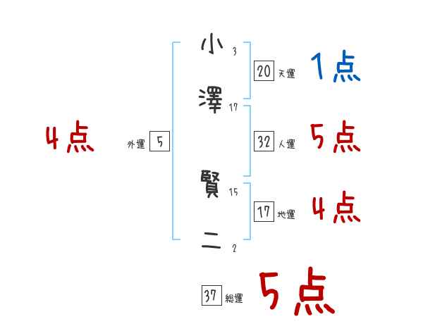 人運![]() | 小澤賢二さんの人運は32画の5つ星!柔軟性があり成功する。チャンスが多く金運が良い。 性格や才能などを表す2番目に重要な運勢です。人間関係や協調性、社会的な成功に影響します。主に20歳から50歳ぐらいまでの中年期の運勢を表します。 |