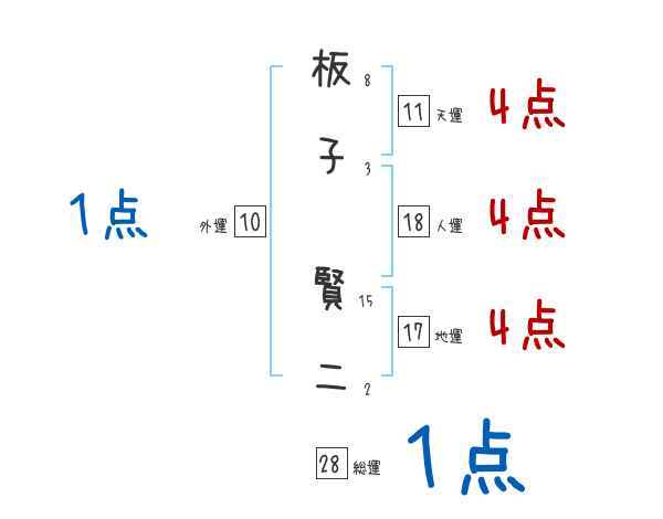 天運![]() | 板子賢二さんの天運は11画の4つ星!着実に富や地位を得る幸運な人生。 家系が持つ宿命的な運勢を表します。祖先から受け継いだ苗字ですので自分の力が及びません。家柄を象徴します。 |