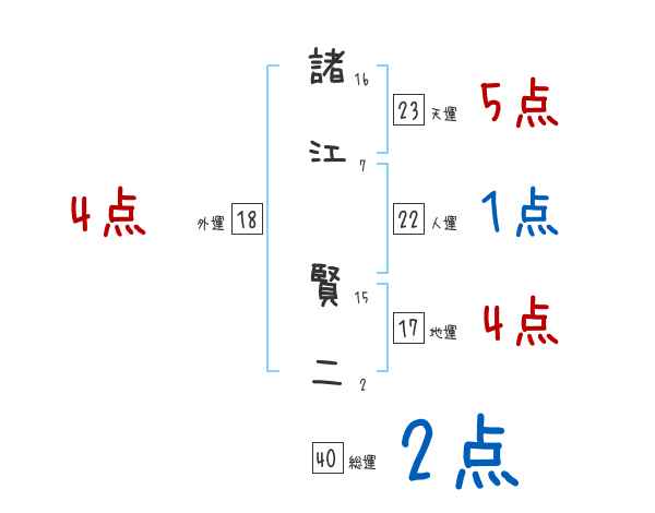 人運![]() | 諸江賢二さんの人運は22画の1つ星!努力することが苦手ないっぽう手先が器用。芸術性にも優れる。 性格や才能などを表す2番目に重要な運勢です。人間関係や協調性、社会的な成功に影響します。主に20歳から50歳ぐらいまでの中年期の運勢を表します。 |