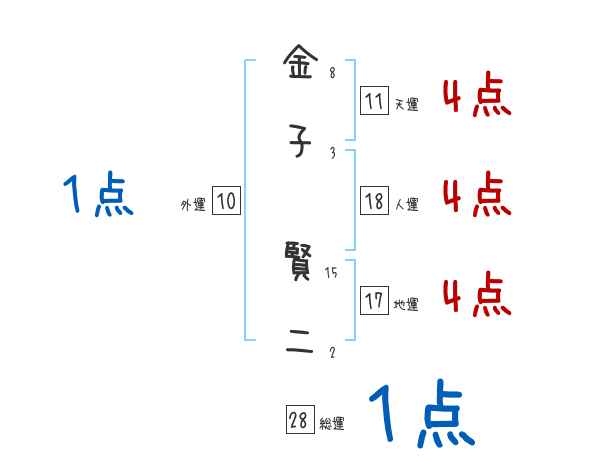 総運![]() | 金子賢二さんの総運は28画の1つ星!家庭環境に注意。スポーツで活躍できる能力があるかも。 あなたの人生を表す1番重要な運勢です。生涯を通じて影響する総合運となり、主に50歳以降の晩年期に影響を及ぼします。 |