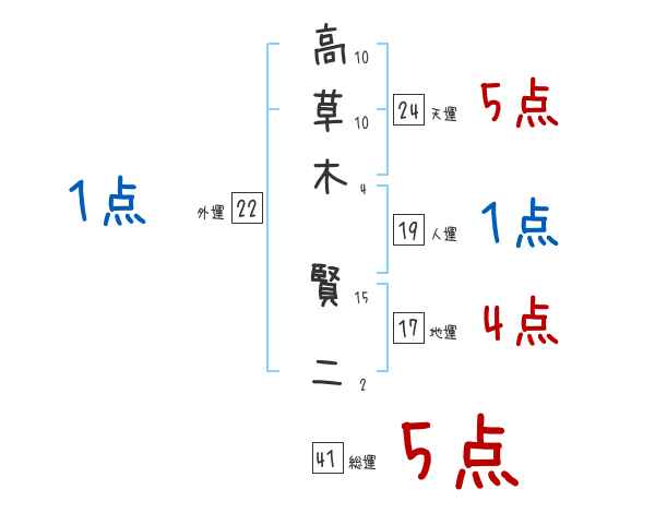 総運![]() | 高草木賢二さんの総運は41画の5つ星!大志を抱き、目標に向かって実力を発揮し達成する。温和な性格。 あなたの人生を表す1番重要な運勢です。生涯を通じて影響する総合運となり、主に50歳以降の晩年期に影響を及ぼします。 |