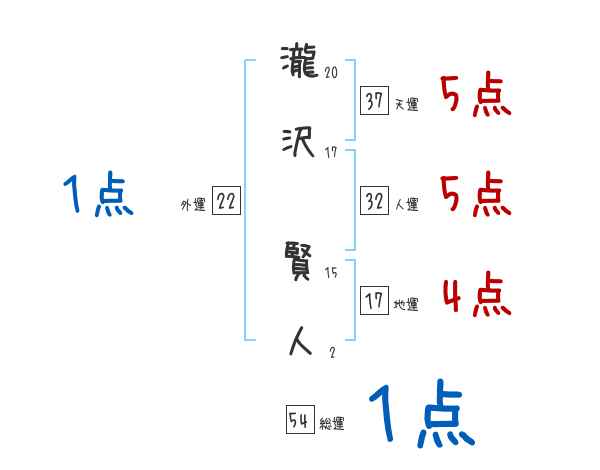 人運![]() | 瀧沢賢人さんの人運は32画の5つ星!柔軟性があり成功する。チャンスが多く金運が良い。 性格や才能などを表す2番目に重要な運勢です。人間関係や協調性、社会的な成功に影響します。主に20歳から50歳ぐらいまでの中年期の運勢を表します。 |