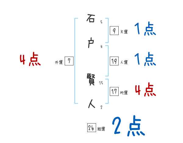 天運![]() | 石戸賢人さんの天運は9画の1つ星!消極的で才能を発揮することが苦手なことも。周りの意見に耳を傾けましょう。 家系が持つ宿命的な運勢を表します。祖先から受け継いだ苗字ですので自分の力が及びません。家柄を象徴します。 |