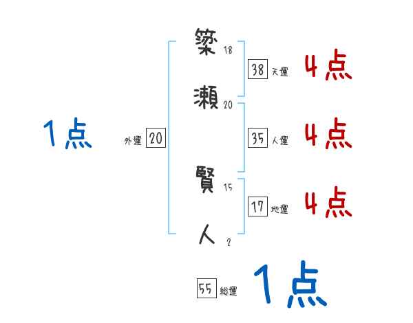 天運![]() | 簗瀬賢人さんの天運は38画の4つ星!温厚な性格で技術的な才能を発揮する。職人的な仕事に向いている。 家系が持つ宿命的な運勢を表します。祖先から受け継いだ苗字ですので自分の力が及びません。家柄を象徴します。 |