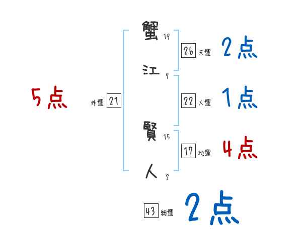 人運![]() | 蟹江賢人さんの人運は22画の1つ星!努力することが苦手ないっぽう手先が器用。芸術性にも優れる。 性格や才能などを表す2番目に重要な運勢です。人間関係や協調性、社会的な成功に影響します。主に20歳から50歳ぐらいまでの中年期の運勢を表します。 |