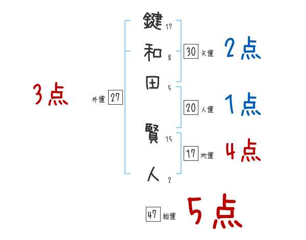 総運![]() | 鍵和田賢人さんの総運は47画の5つ星!実力が開花し発展する円満な人生。財に恵まれる。 あなたの人生を表す1番重要な運勢です。生涯を通じて影響する総合運となり、主に50歳以降の晩年期に影響を及ぼします。 |