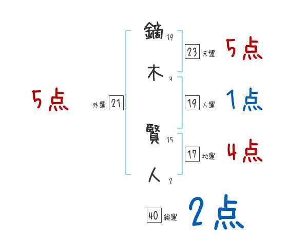 天運![]() | 鏑木賢人さんの天運は23画の5つ星!想像力に優れ活力がある。一代で成功し名誉を手に入れる。 家系が持つ宿命的な運勢を表します。祖先から受け継いだ苗字ですので自分の力が及びません。家柄を象徴します。 |