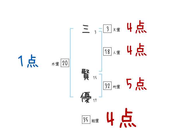天運![]() | 三賢優さんの天運は3画の4つ星!活動的で才能に恵まれ、多くの信頼を得る。希望に満ち成長する。 家系が持つ宿命的な運勢を表します。祖先から受け継いだ苗字ですので自分の力が及びません。家柄を象徴します。 |