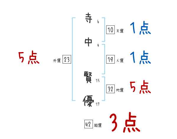 天運![]() | 寺中賢優さんの天運は10画の1つ星!不安を感じやすい傾向。ストレスを抱えないように注意しましょう。 家系が持つ宿命的な運勢を表します。祖先から受け継いだ苗字ですので自分の力が及びません。家柄を象徴します。 |