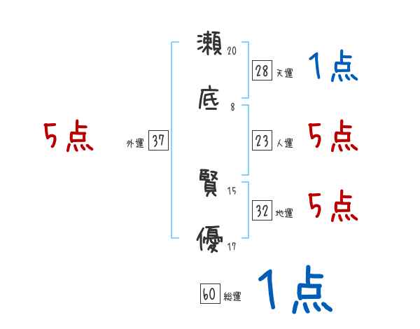外運![]() | 瀬底賢優さんの外運は37画の5つ星!努力家で順応性に優れる。現実的な考え方ができ忠実に物事をこなす。 生活面を象徴する運勢です。外部から受ける影響力を表し、結婚運、家庭運や職場、環境への順応性を表します。 |
