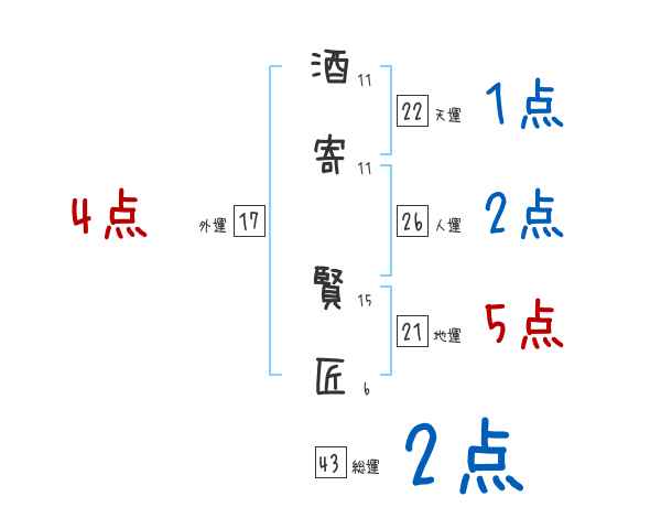 外運![]() | 酒寄賢匠さんの外運は17画の4つ星!積極的な行動力。地位を気づき財産を手に入れる。純粋な心と直感力。 生活面を象徴する運勢です。外部から受ける影響力を表し、結婚運、家庭運や職場、環境への順応性を表します。 |