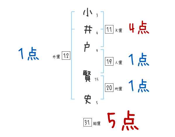 天運![]() | 小井戸賢史さんの天運は11画の4つ星!着実に富や地位を得る幸運な人生。 家系が持つ宿命的な運勢を表します。祖先から受け継いだ苗字ですので自分の力が及びません。家柄を象徴します。 |
