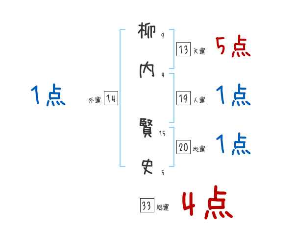 総運![]() | 柳内賢史さんの総運は33画の4つ星!権力志向でプライドが高い。勇気があり運を切り開き成功する。 あなたの人生を表す1番重要な運勢です。生涯を通じて影響する総合運となり、主に50歳以降の晩年期に影響を及ぼします。 |