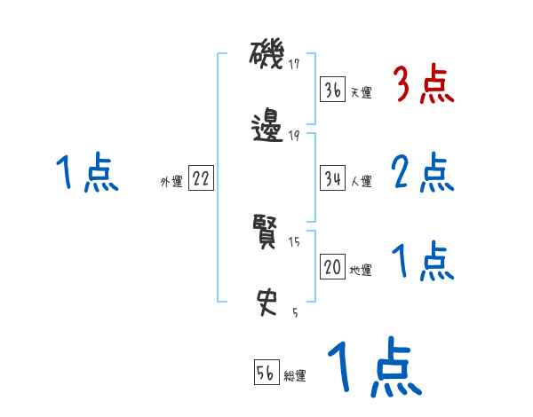 外運![]() | 磯邊賢史さんの外運は22画の1つ星!努力することが苦手ないっぽう手先が器用。芸術性にも優れる。 生活面を象徴する運勢です。外部から受ける影響力を表し、結婚運、家庭運や職場、環境への順応性を表します。 |
