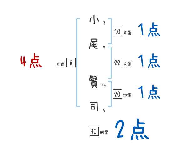 総運![]() | 小尾賢司さんの総運は30画の2つ星!浮き沈みの激しさに注意しましょう。 あなたの人生を表す1番重要な運勢です。生涯を通じて影響する総合運となり、主に50歳以降の晩年期に影響を及ぼします。 |