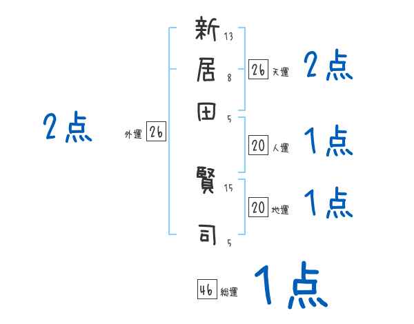 総運![]() | 新居田賢司さんの総運は46画の1つ星!迷走することが多く苦労するかも。目先のことにとらわれないように。 あなたの人生を表す1番重要な運勢です。生涯を通じて影響する総合運となり、主に50歳以降の晩年期に影響を及ぼします。 |