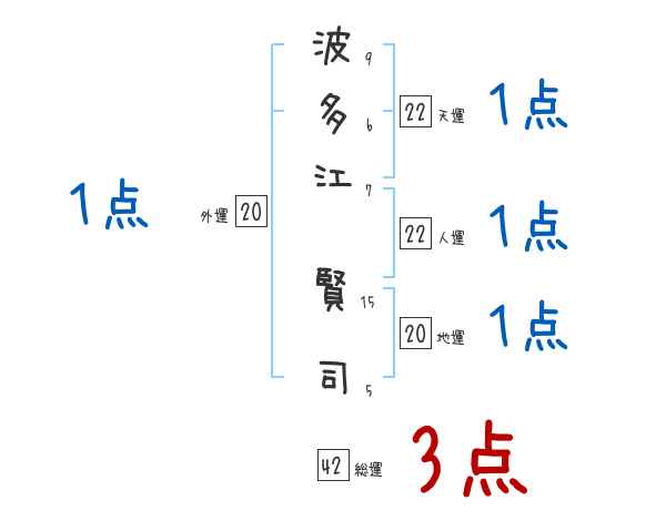天運![]() | 波多江賢司さんの天運は22画の1つ星!努力することが苦手ないっぽう手先が器用。芸術性にも優れる。 家系が持つ宿命的な運勢を表します。祖先から受け継いだ苗字ですので自分の力が及びません。家柄を象徴します。 |