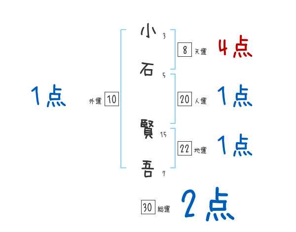 外運![]() | 小石賢吾さんの外運は10画の1つ星!不安を感じやすい傾向。ストレスを抱えないように注意しましょう。 生活面を象徴する運勢です。外部から受ける影響力を表し、結婚運、家庭運や職場、環境への順応性を表します。 |