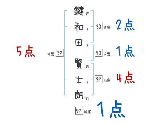 外運![]() | 鍵和田賢士朗さんの外運は39画の5つ星!社交性に優れ人望が厚い。人の上に立ち成功する。 生活面を象徴する運勢です。外部から受ける影響力を表し、結婚運、家庭運や職場、環境への順応性を表します。 |