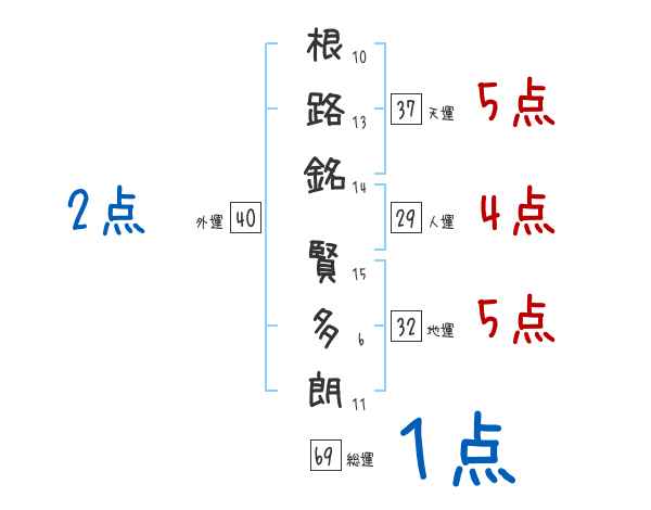 地運![]() | 根路銘賢多朗さんの地運は32画の5つ星!柔軟性があり成功する。チャンスが多く金運が良い。 個性を表す基礎的な運勢です。性格形成や対人関係、行動力など家庭環境に影響されます。主に誕生してから20歳くらいまでの若年期の運勢を表します。 |