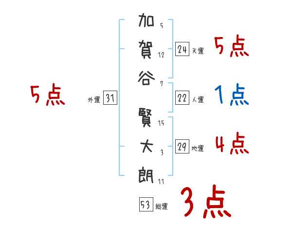 総運![]() | 加賀谷賢大朗さんの総運は53画の3つ星!やや見栄っ張りで虚栄心がある。散財に注意。 あなたの人生を表す1番重要な運勢です。生涯を通じて影響する総合運となり、主に50歳以降の晩年期に影響を及ぼします。 |