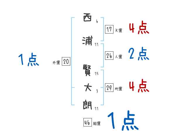 天運![]() | 西浦賢大朗さんの天運は17画の4つ星!積極的な行動力。地位を気づき財産を手に入れる。純粋な心と直感力。 家系が持つ宿命的な運勢を表します。祖先から受け継いだ苗字ですので自分の力が及びません。家柄を象徴します。 |
