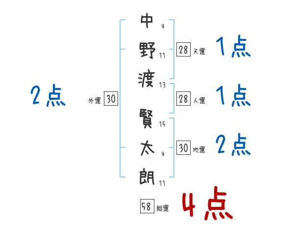 天運![]() | 中野渡賢太朗さんの天運は28画の1つ星!家庭環境に注意。スポーツで活躍できる能力があるかも。 家系が持つ宿命的な運勢を表します。祖先から受け継いだ苗字ですので自分の力が及びません。家柄を象徴します。 |