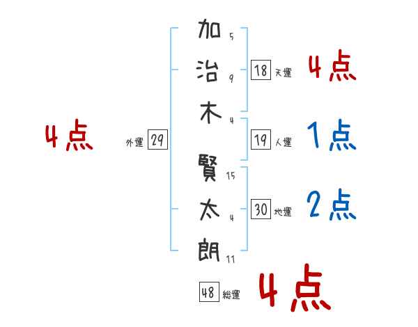 外運![]() | 加治木賢太朗さんの外運は29画の4つ星!完全主義で才能がある。厳格な心の持ち主。 生活面を象徴する運勢です。外部から受ける影響力を表し、結婚運、家庭運や職場、環境への順応性を表します。 |