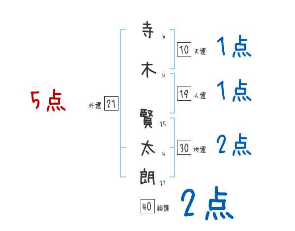 外運![]() | 寺木賢太朗さんの外運は21画の5つ星!統率力がある。独立し成功する。名誉を手に入れる。 生活面を象徴する運勢です。外部から受ける影響力を表し、結婚運、家庭運や職場、環境への順応性を表します。 |