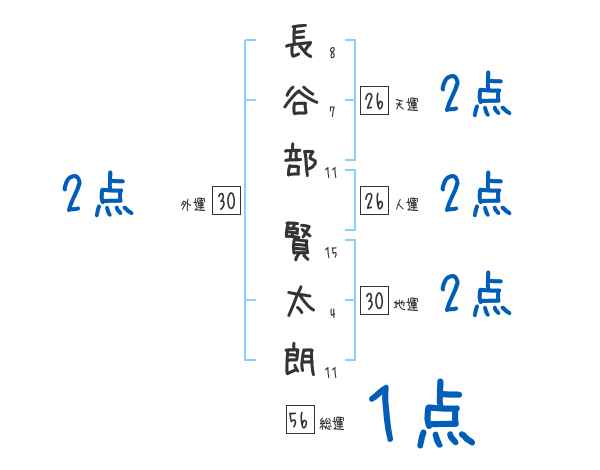 天運![]() | 長谷部賢太朗さんの天運は26画の2つ星!波瀾万丈かも。信頼できる人を大事にしましょう。 家系が持つ宿命的な運勢を表します。祖先から受け継いだ苗字ですので自分の力が及びません。家柄を象徴します。 |